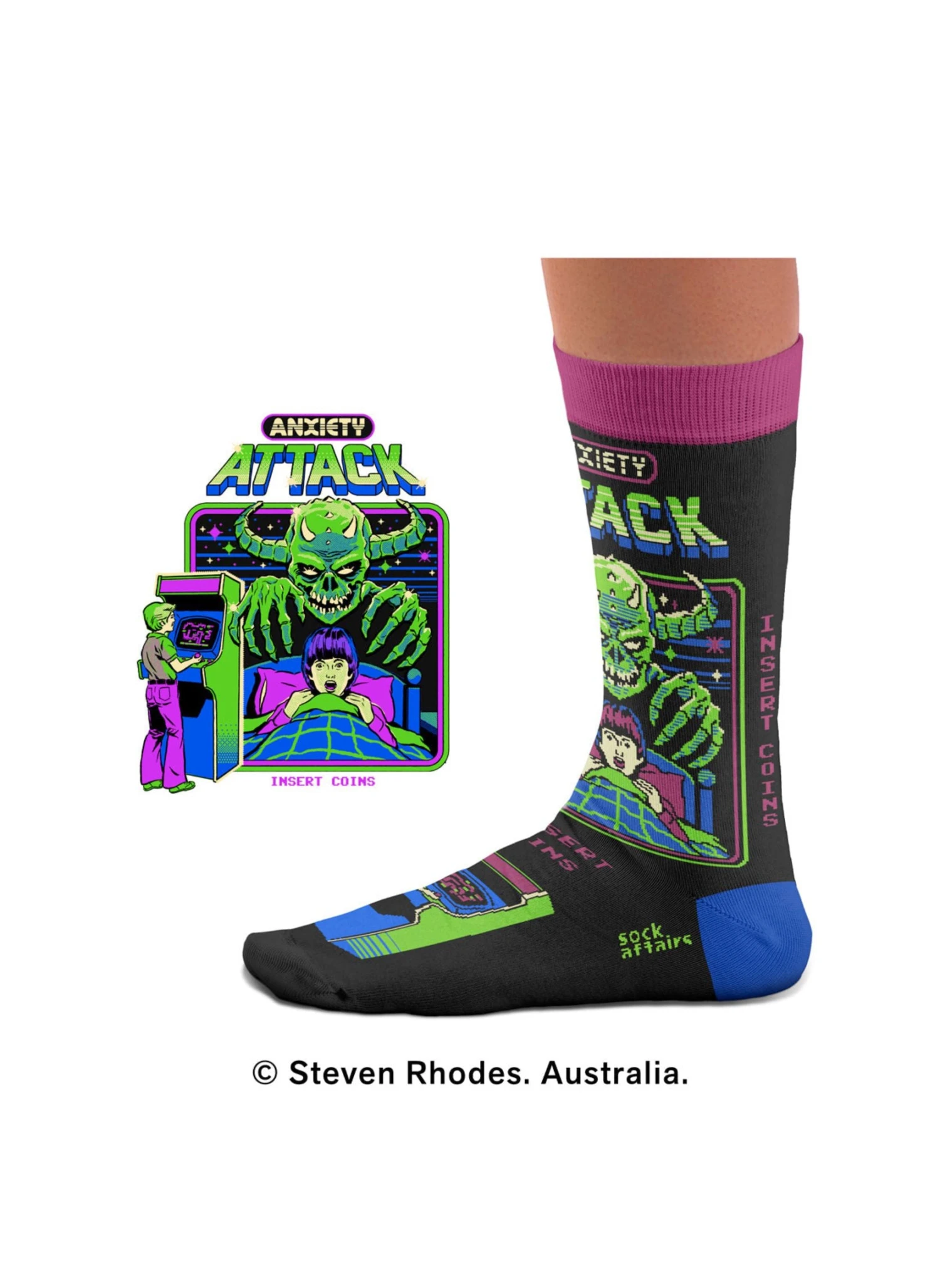 Osez afficher vos états d’âme avec les chaussettes « Anxiety Attack » signées Steven Rhodes ! Avec leur design vintage et leur humour noir bien dosé, elles abordent l’anxiété avec style et dérision. Un mix parfait entre originalité, autodérision et message fort.