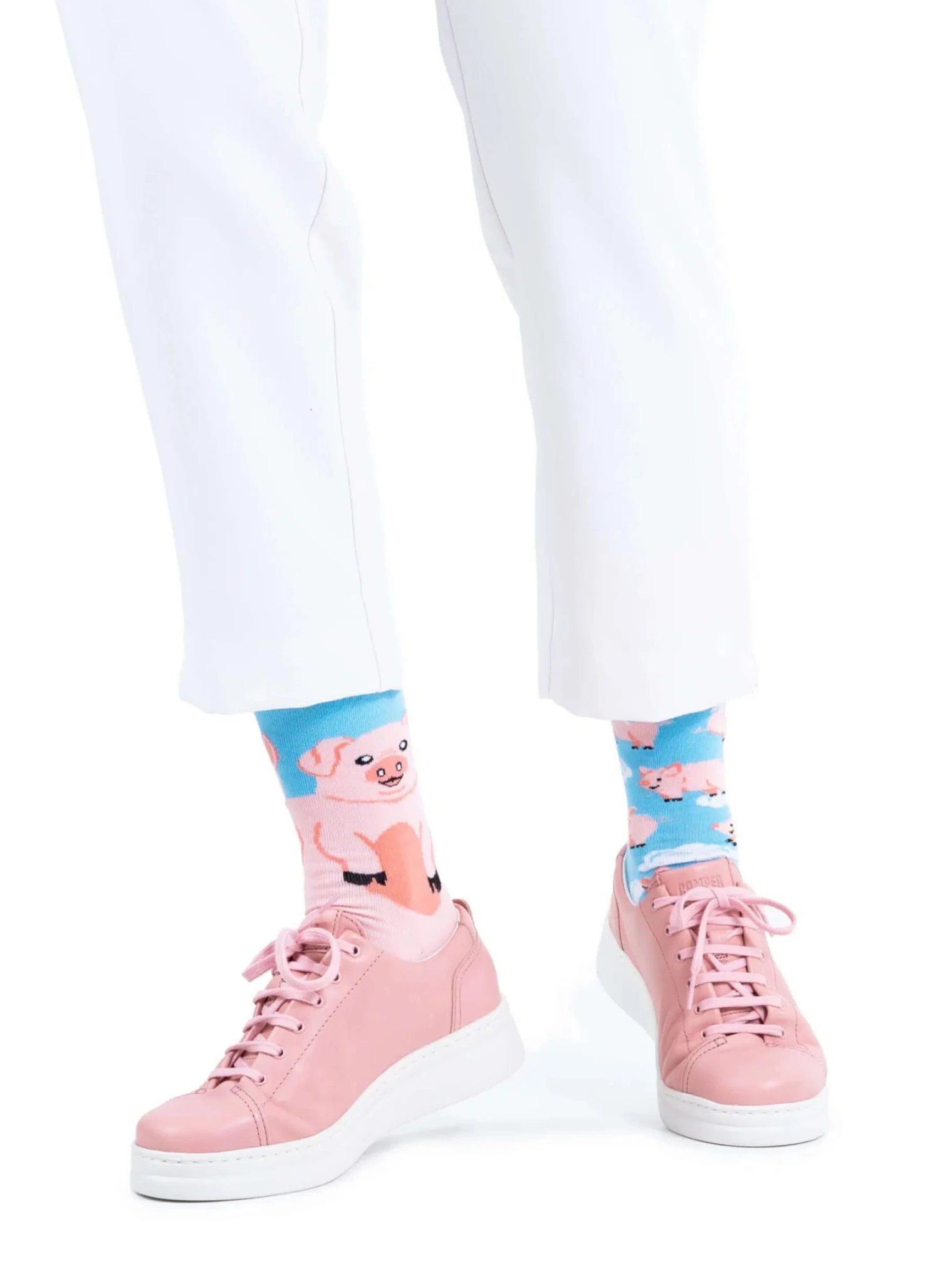 Enfilez ces chaussettes et laissez-vous porter par un nuage de tendresse, en compagnie de joyeux petits cochons. Flottant dans un ciel pastel, ils vous apportent à chaque regard une bouffée de douceur et un sourire spontané.