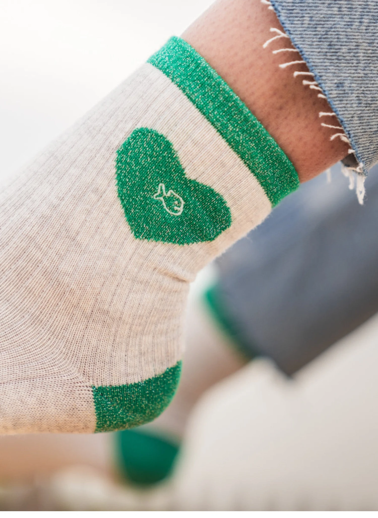 Apportez une touche d’originalité à votre tenue avec ces chaussettes unies blanches et cœur pailleté vert. Elles sont en coton peigné et remaillée à la main. Ces chaussettes sont confortables et durables.