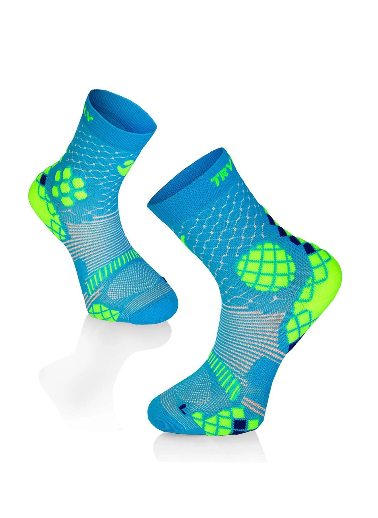 Avec ces chaussettes turquoises et jaunes profitez d’une compression élevée pour une meilleure circulation sanguine et une diminution de la fatigue musculaire pendant l’effort.
