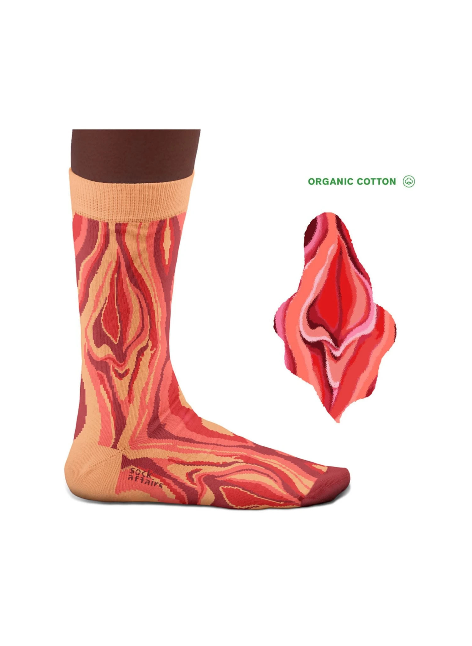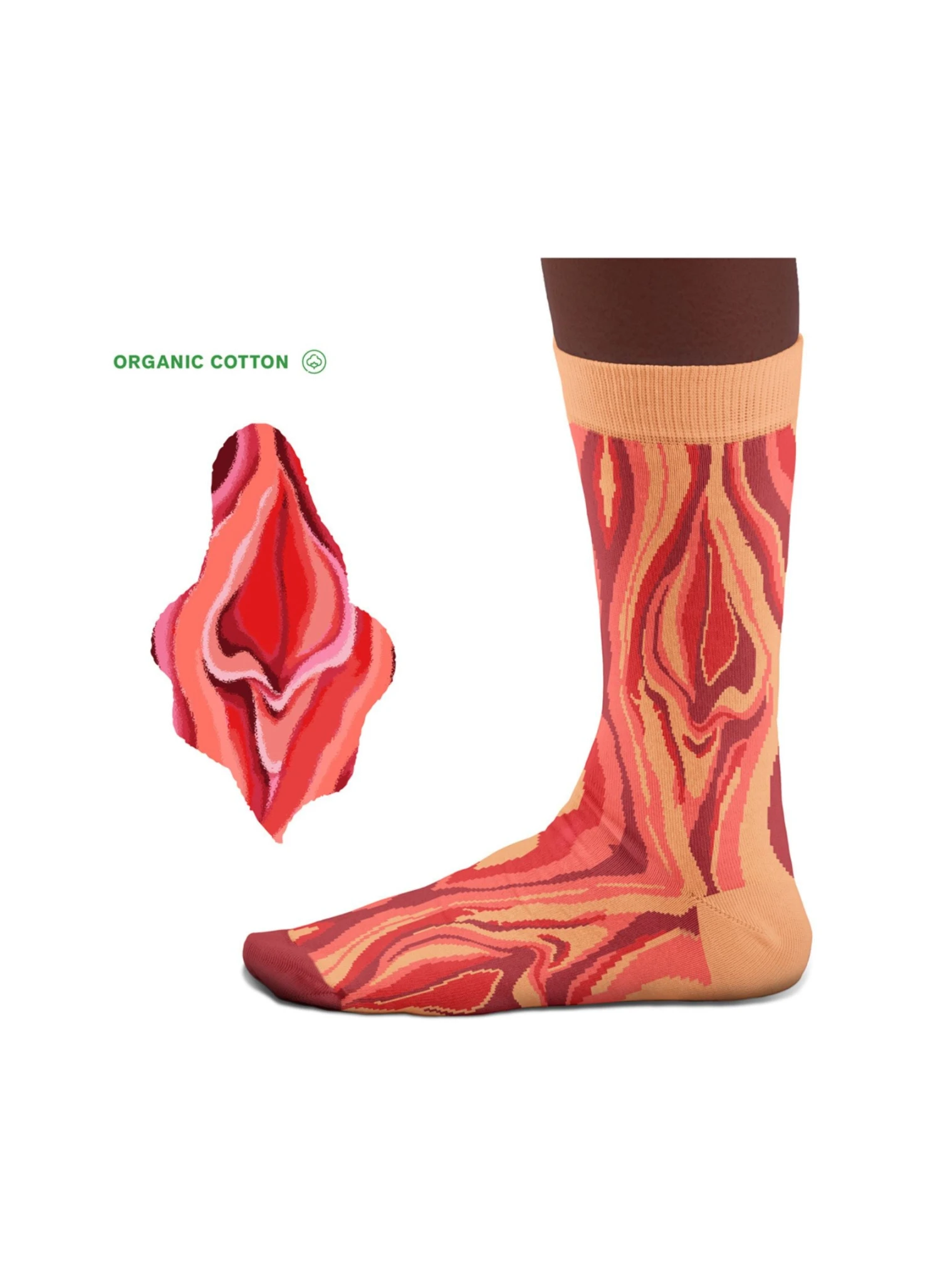 Faites l’expérience de l’audace et de l’expression personnelle avec les chaussettes »vulves ». Ces chaussettes, fabriquées à partir de coton biologique, arborent un motif artistique inspiré de la beauté naturelle du corps féminin. Avec leur palette de teintes terreuses et leurs accents écarlates, elles sont conçues pour ceux qui osent afficher fièrement leur soutien à la liberté corporelle et à la célébration de la féminité. Chaque pas porte en lui une affirmation de force et un hommage au pouvoir créateur de la femme.