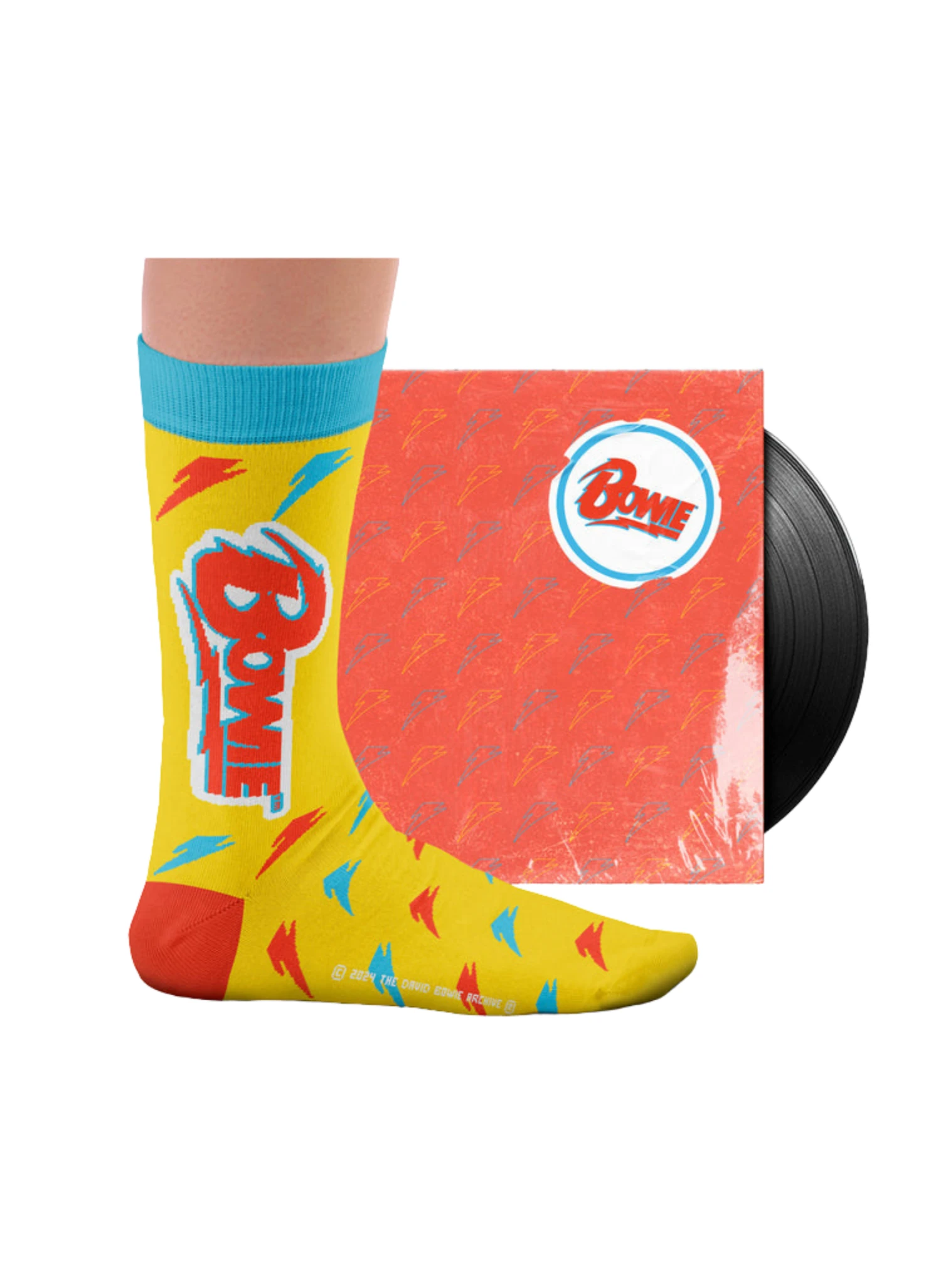 Les chaussettes jaunes éclatantes inspirées de la foudre iconique de David Bowie sont là ! Parfaites pour réveiller votre Ziggy Stardust intérieur, elles arborent l’éclair légendaire, symbole de l’alter ego Aladdin Sane. Douces, confortables, et un brin décalées, ces chaussettes feront briller votre journée, même par temps gris.
