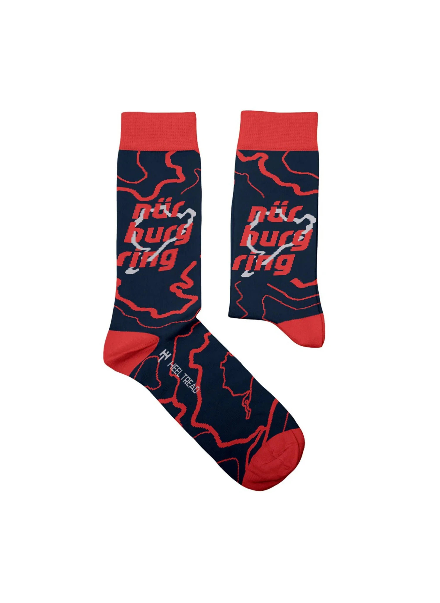 Affichez votre passion pour le sport automobile avec discrétion et style grâce à nos chaussettes Nürburgring à lettrage intégré. Chaque paire est ornée de lettres inspirées du légendaire circuit allemand, qu’il s’agisse du nom « NÜRBURGRING » tissé sur la tige, ou d’un motif répété stylisé en lettres modernes autour de la cheville.