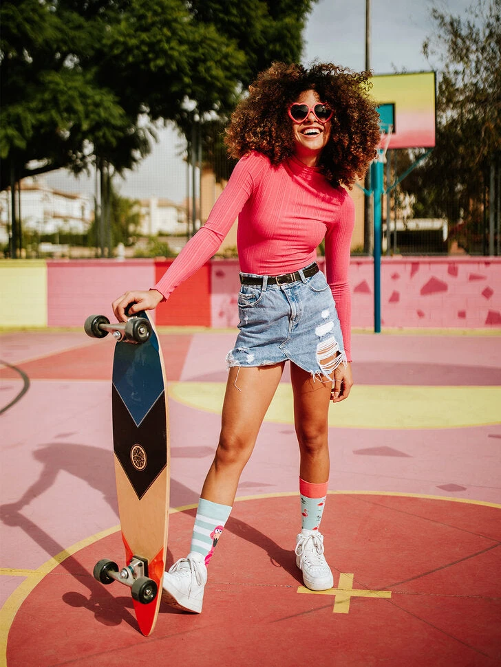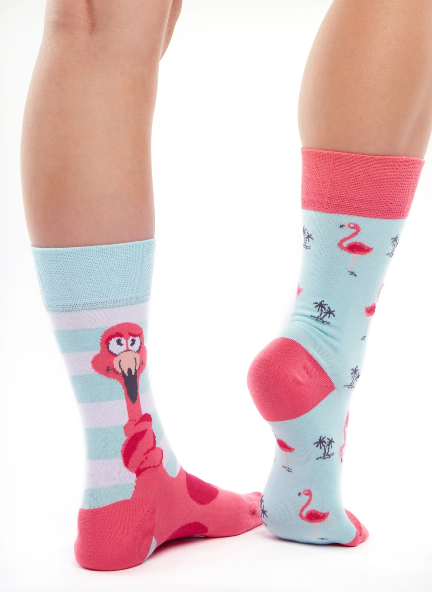 Il a la gorge nouée notre beau flamant rose sur ces chaussettes originales. Cela ne l’empêchera pas de vous faire remarquer quand vous les porterez et de mettre des sourires sur les visages.