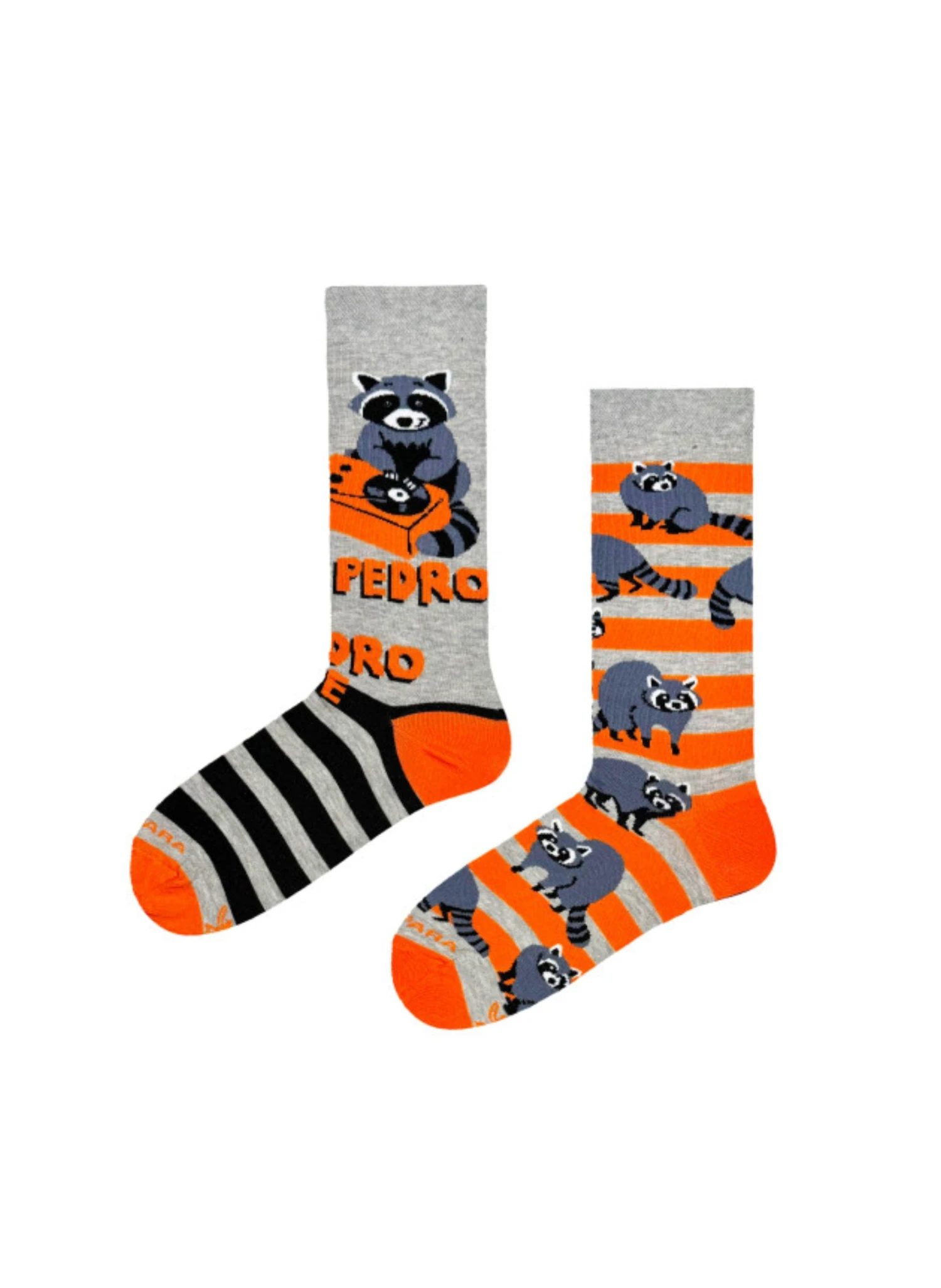 Avec son regard de filou et son masque de super-héros de la forêt, Pedro est prêt à transformer vos pieds en scène de crime… de style. Attention : il a peut-être déjà volé vos chaussettes gauches.