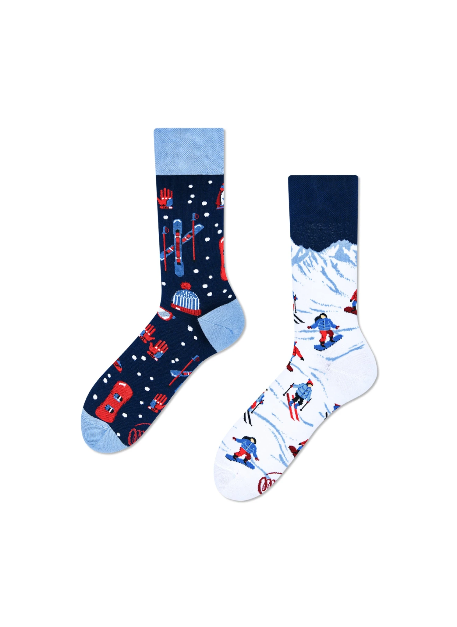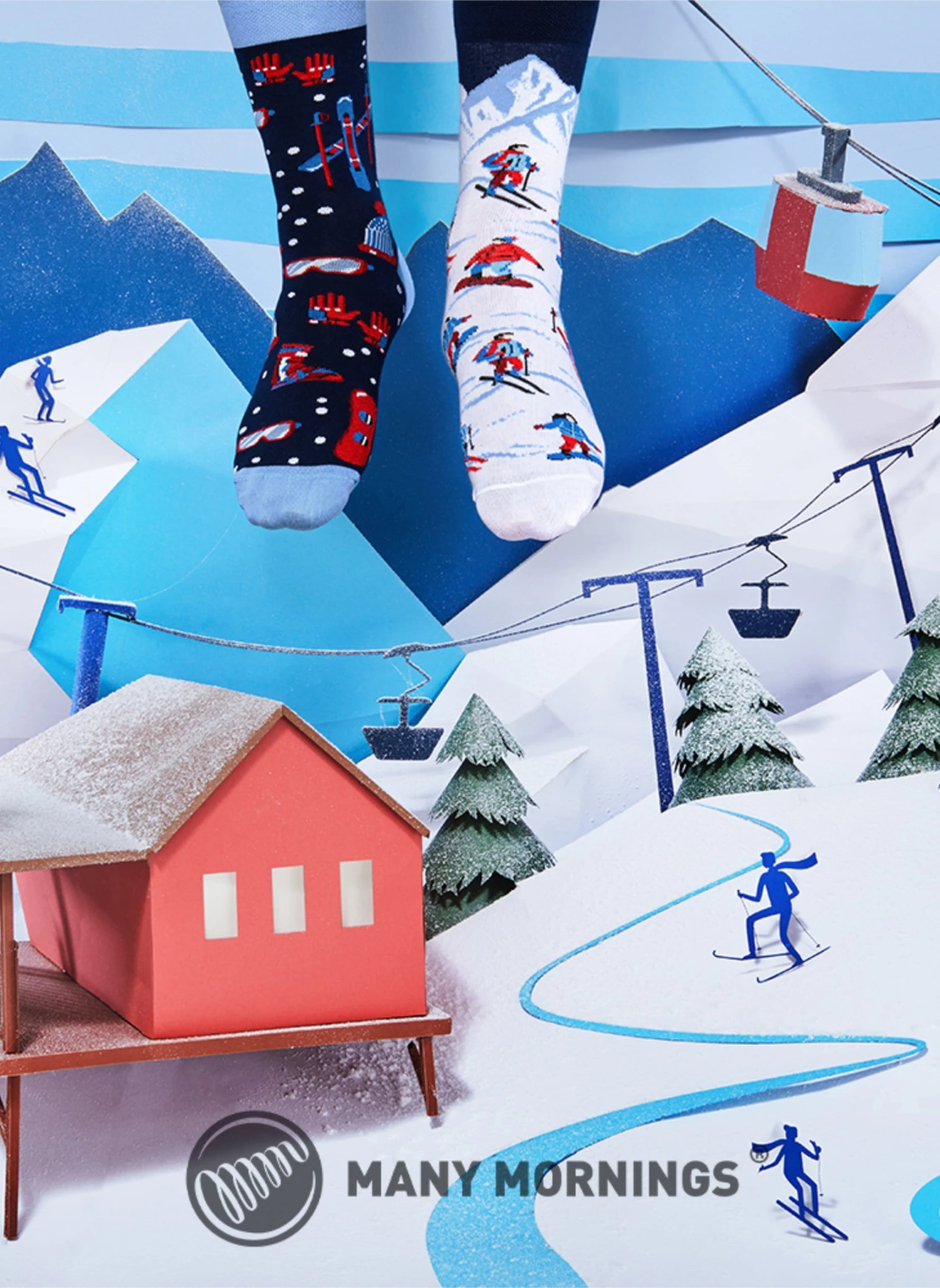 Many Mornings adore l’hiver et faire du ski. C’est pourquoi ils proposent ces chaussettes dépareillées originales. Vous aurez de l’allure au chalet après une bonne journée tout schuss !!!