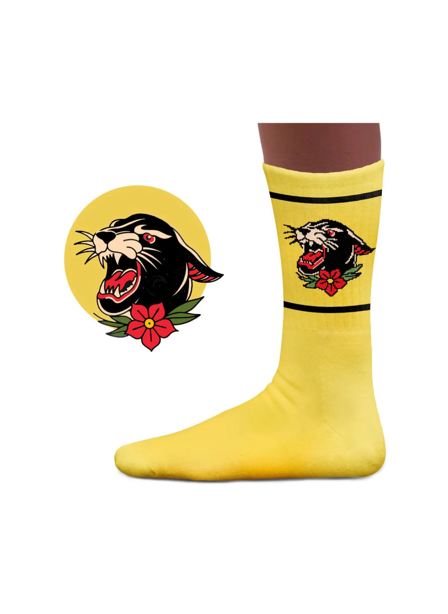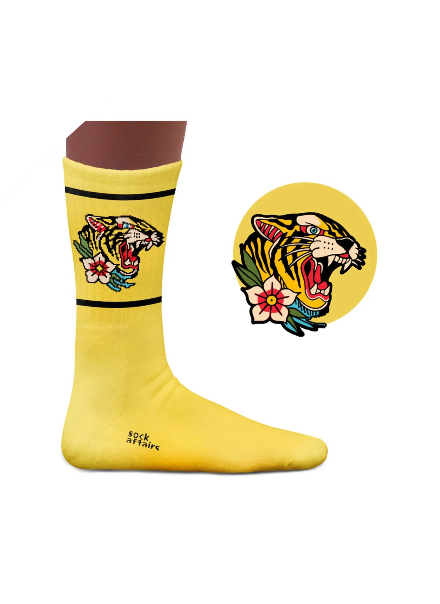 Boostez votre énergie avec ces chaussettes de sport jaunes au design unique ! Tigre et puma se font face dans un style tatouage old school, symbole de puissance et d’agilité.