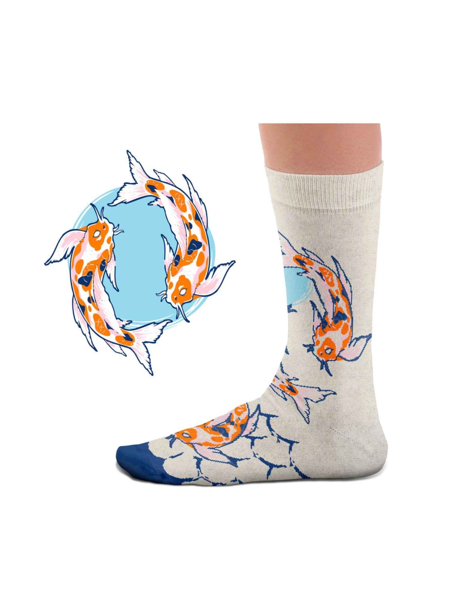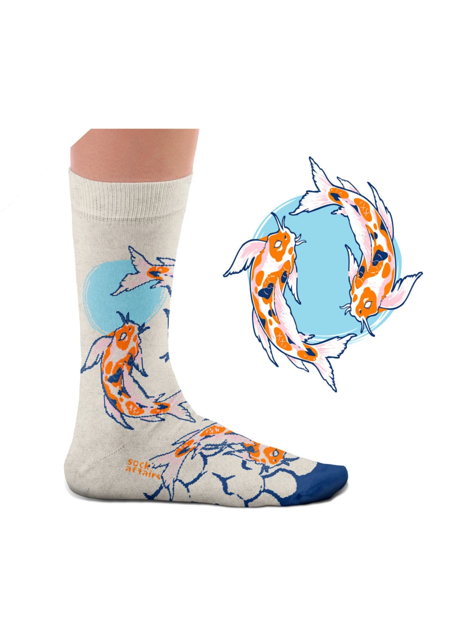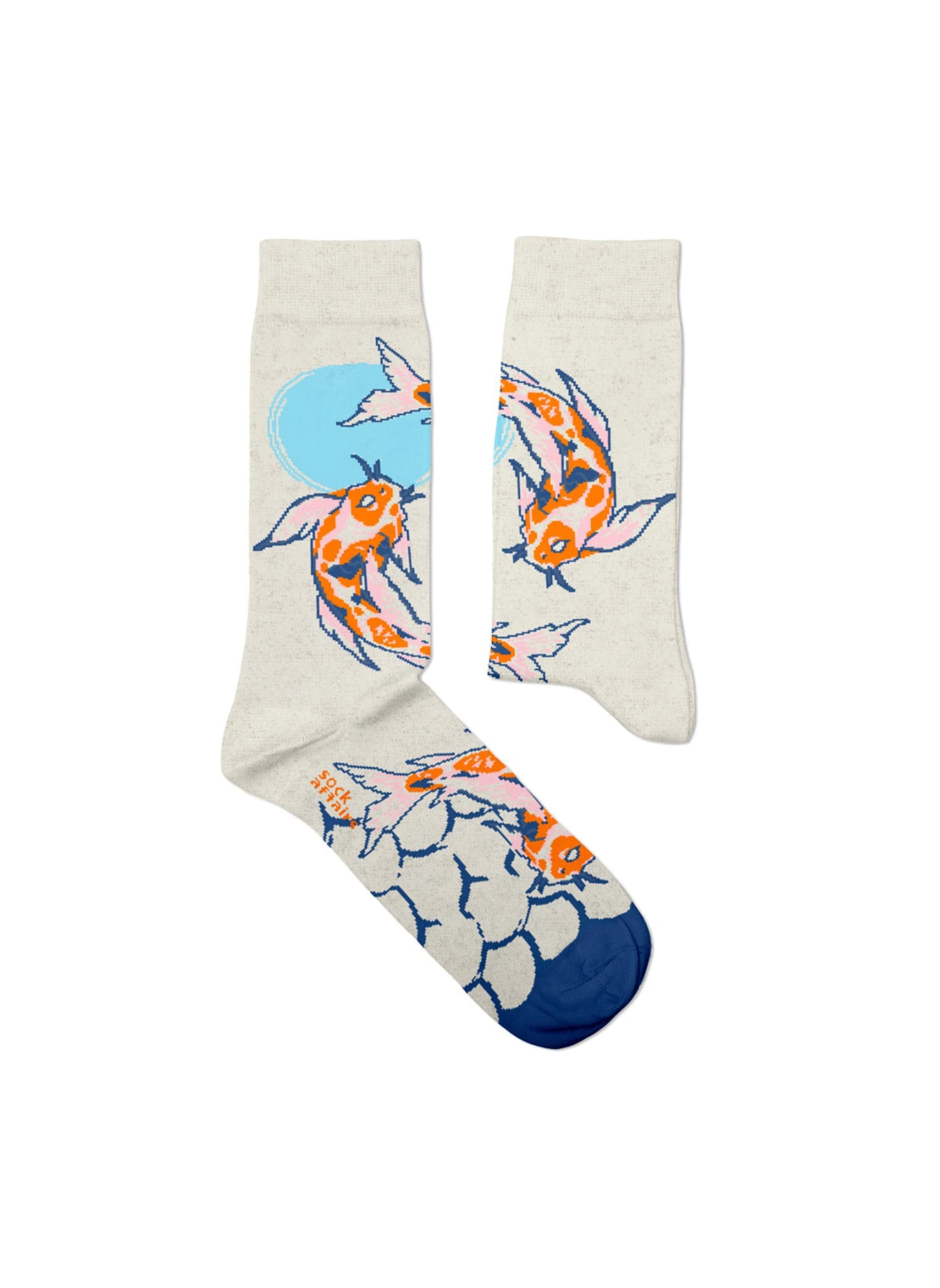 Plongez dans la tradition avec les chaussettes Tatouage Carpes, inspirées de l’art japonais des carpes koï. Symboles de force, de persévérance et de chance, ces nageurs orange et blancs flottent sur un doux fond d’écailles et de vagues. Leur design allie mouvement et sens pour créer une toile de fond confortable, emplie de sérénité et de vitalité. Une énergie apaisante à vos pieds.