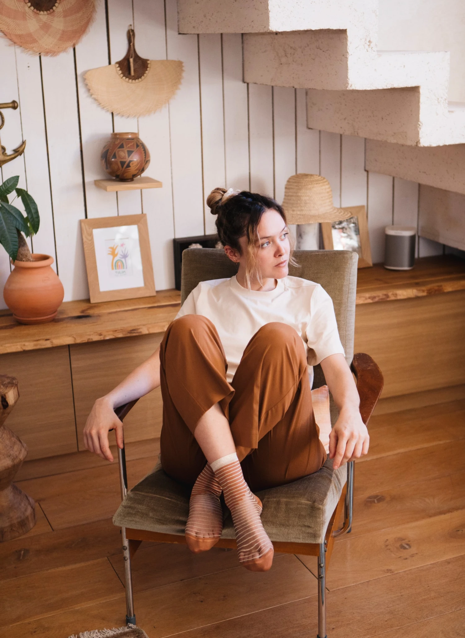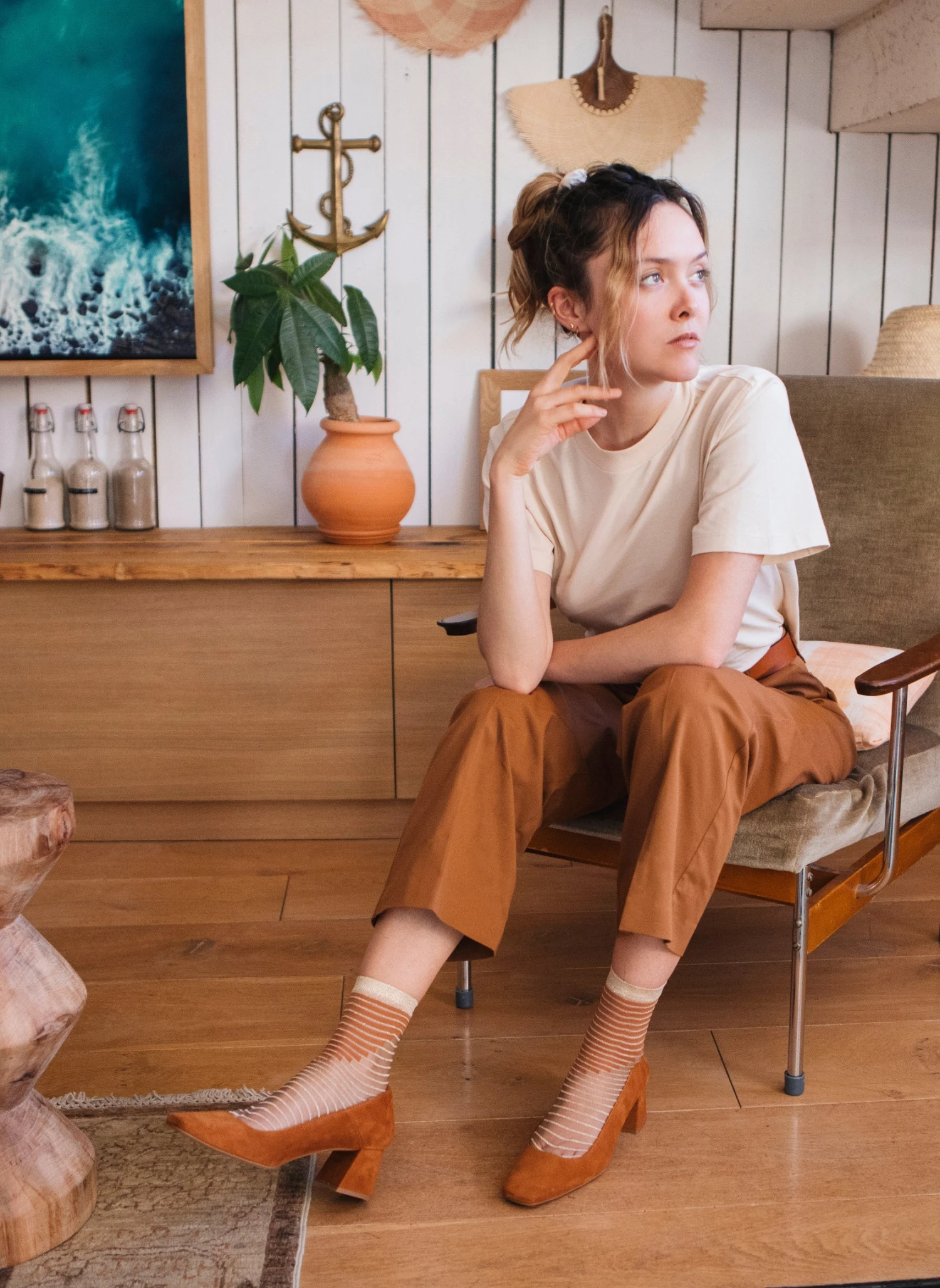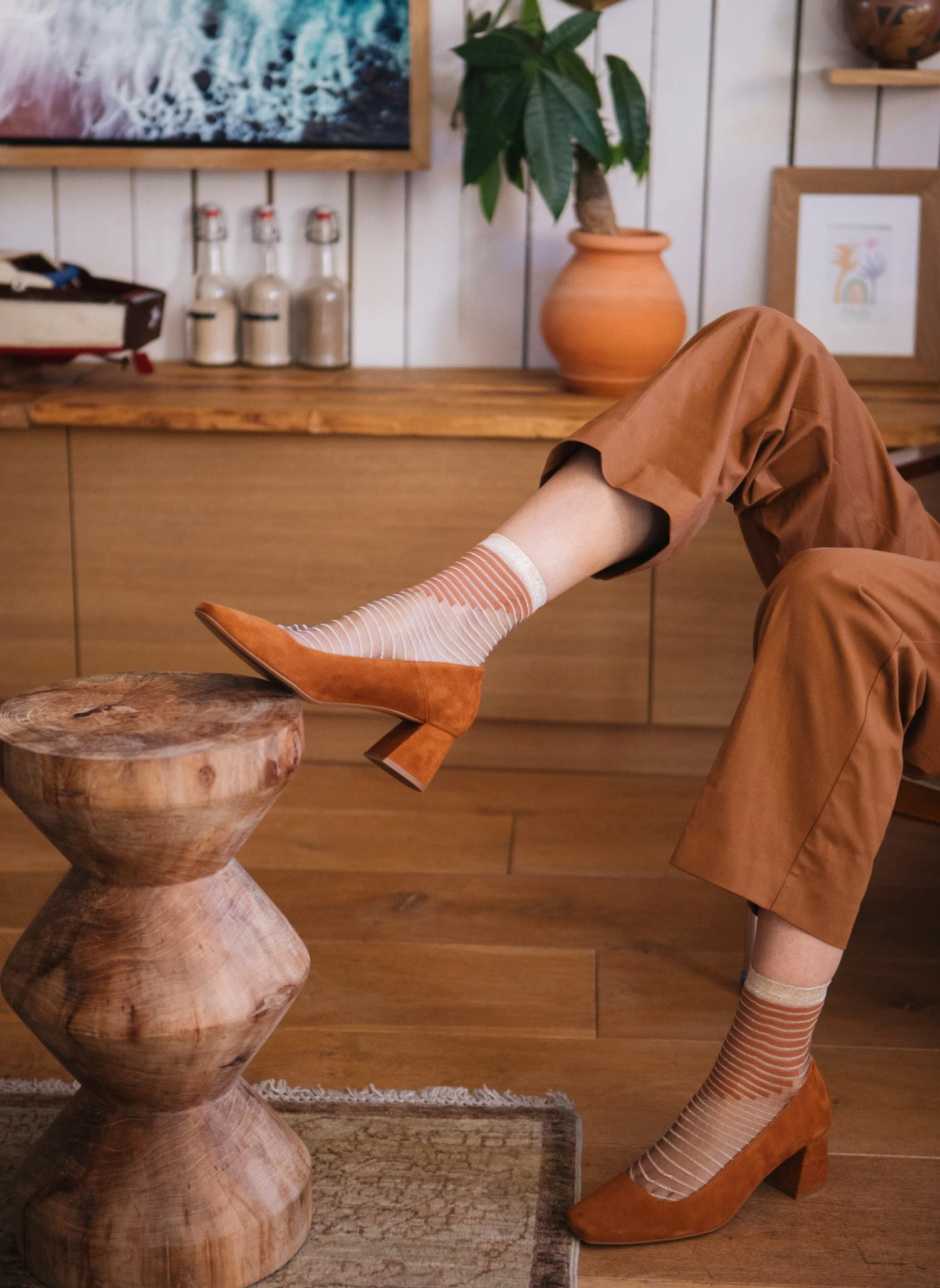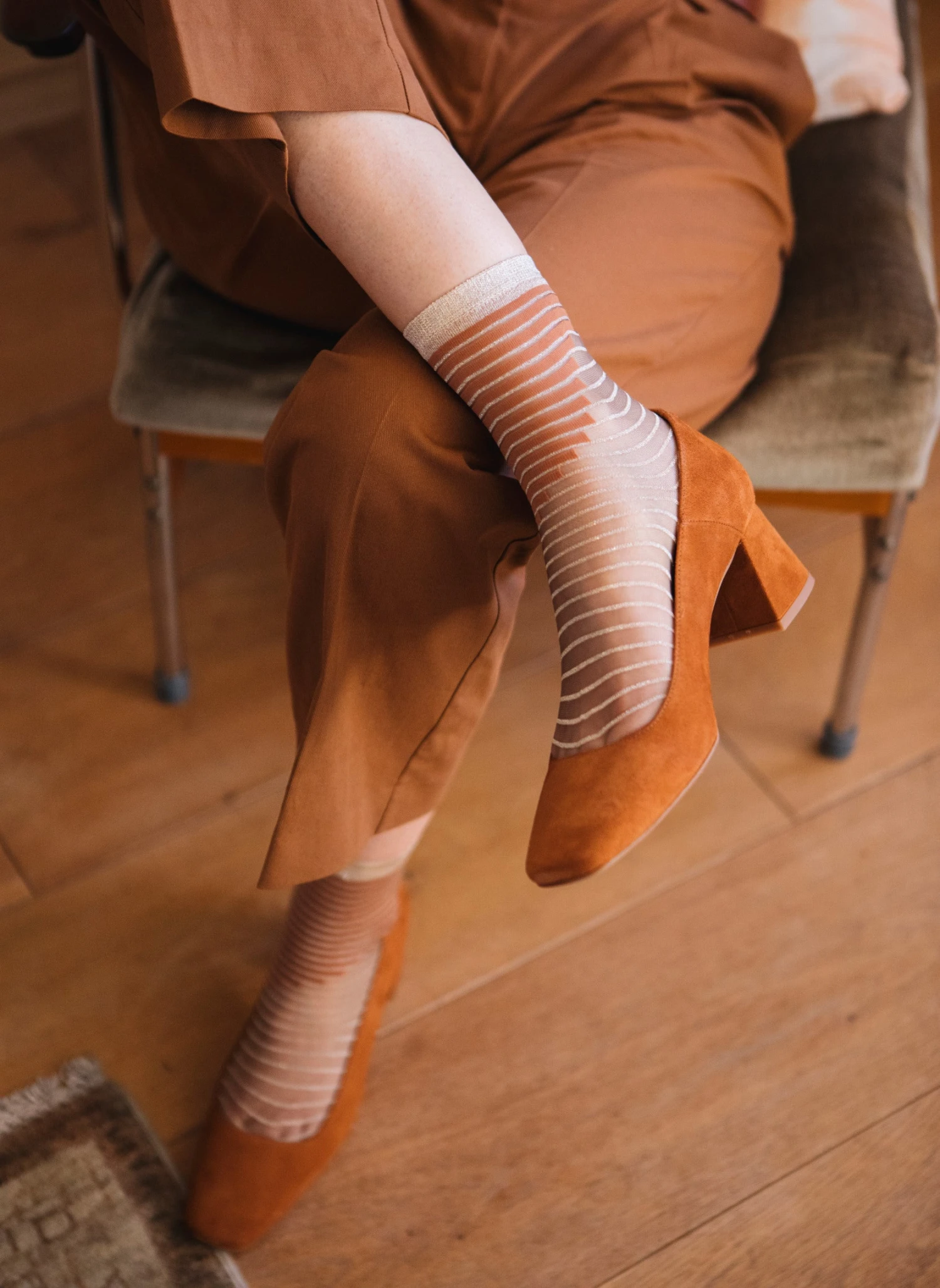 Ces chaussettes transparentes Shibuya Caramel se porteront avec tout : mocassins, derbies ou classiques baskets blanches. Leurs paillettes dorées illumineront vos tenues préférées. Modèle inspiré des fameux passages piétons de Shibuya à Tokyo.