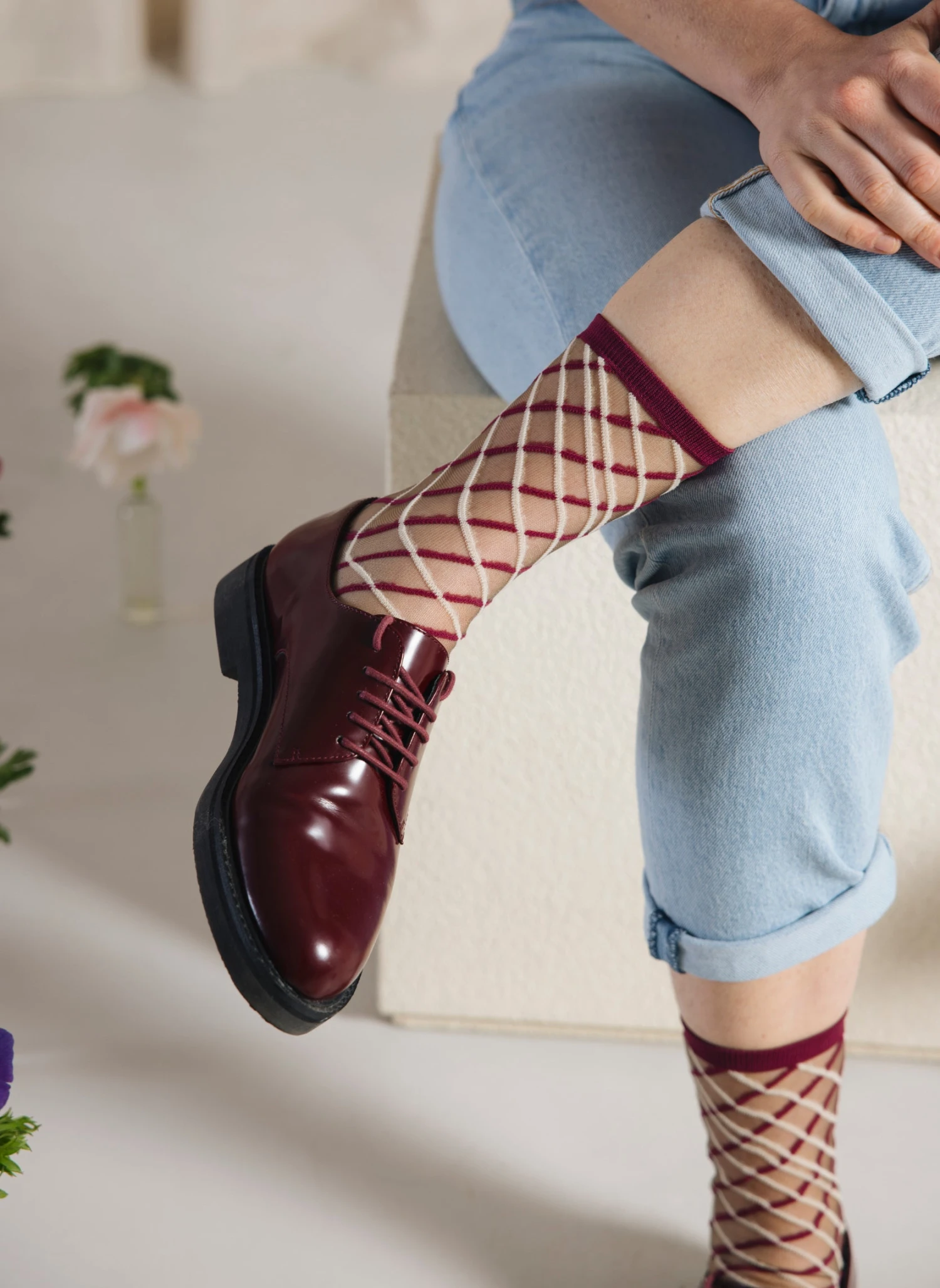 Tricotées de bordeaux et de beige, ces chaussettes transparentes au style résilles suivent les couleurs tendances de la saison. Sortez votre jean et vos mocassins, l’effet sera garanti ! Ce modèle est inspiré du croisement des câbles du pont de Brooklyn de New-York.