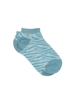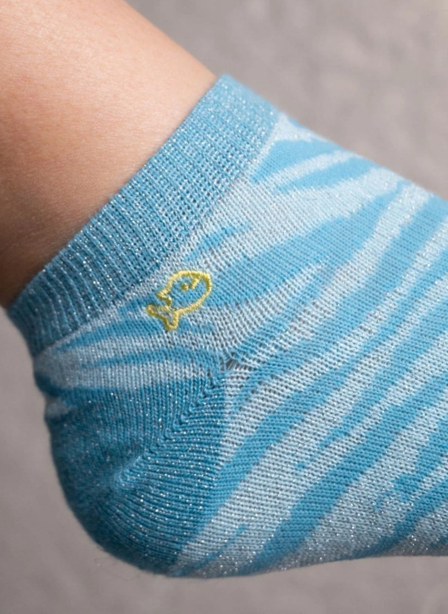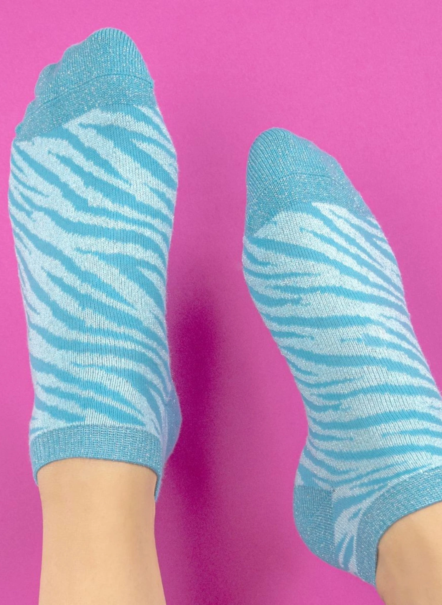 Apportez une touche d’originalité à votre tenue avec ces socquettes pailletées et zébrées bleues. Elles sont en coton peigné et remaillée à la main. Ces socquettes sont confortables et durables.