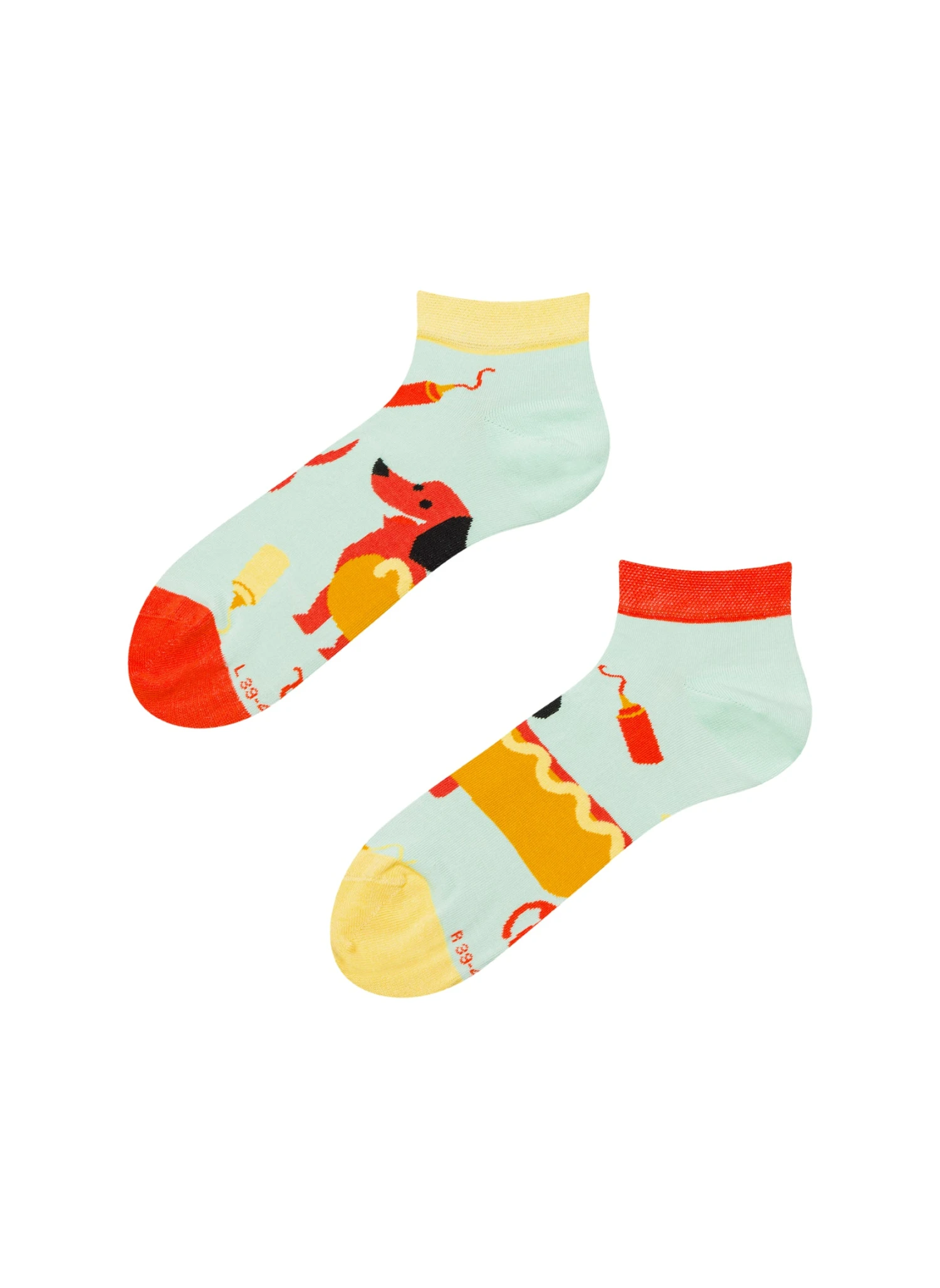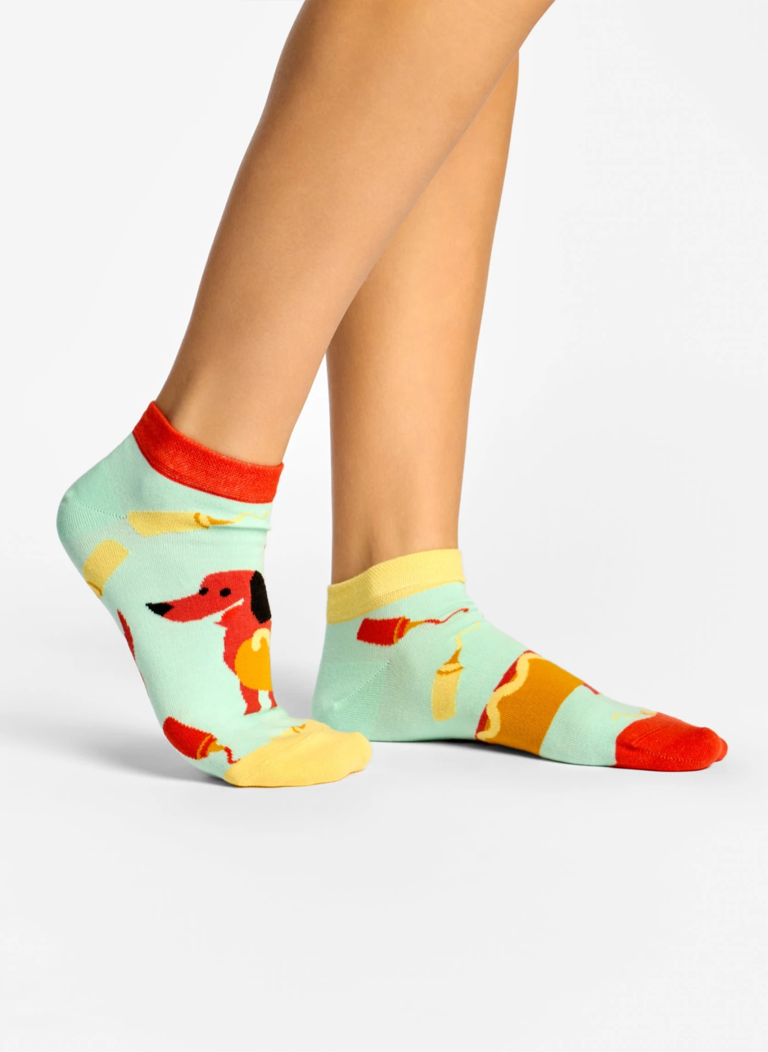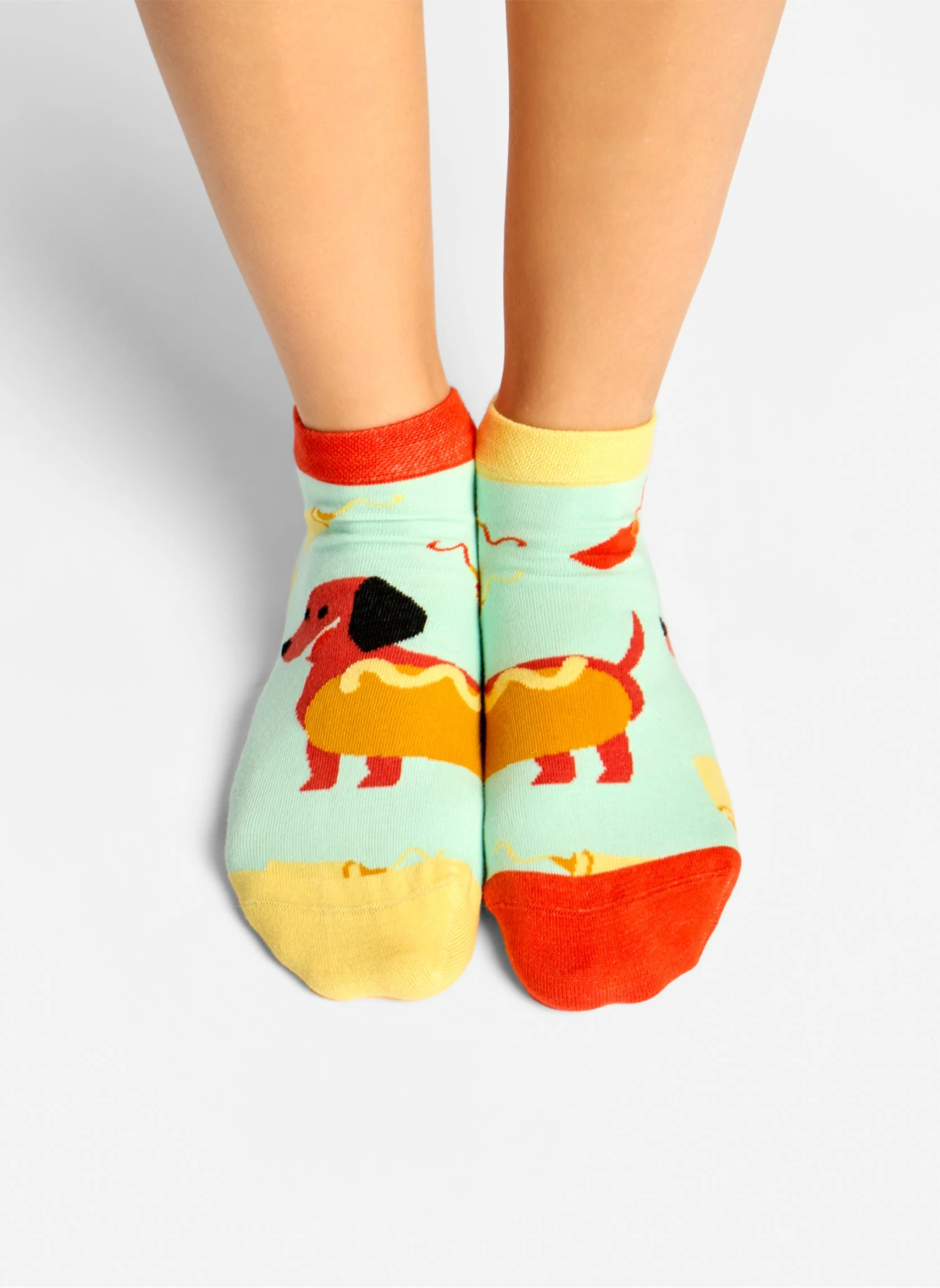 Amusez-vous avec ces socquettes Teckel Hotdog ! Des motifs originaux de teckel jouant dans un hotdog. Un clin d’oeil au surnom « chien saucisse » du teckel. Des chaussettes fantaisies qui vous feront sourire à chaque pas ! (Pas de chien saucisses, promis!)